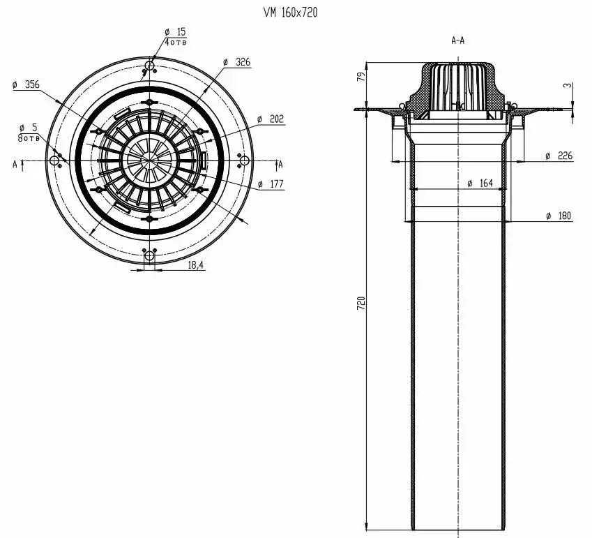 Воронка кровельная VM 160x720, с металлическим обжимным фланцем, без обогрева и листоуловителем - артикул: 01.093 - материал корпуса - морозостойкий полипропилен - высота выпуска: 720 мм - монтажный диаметр: 160 мм - пропускная способность 12 л/c - обогрев: нет - срок службы: не менее 50 лет - гарантия: 1 год - применение: жилые и общественные здания, ФОКи, промышленные здания и сооружения, торговые комплексы и магазины, частные дома.а.